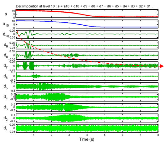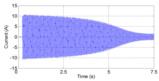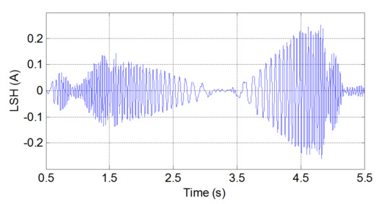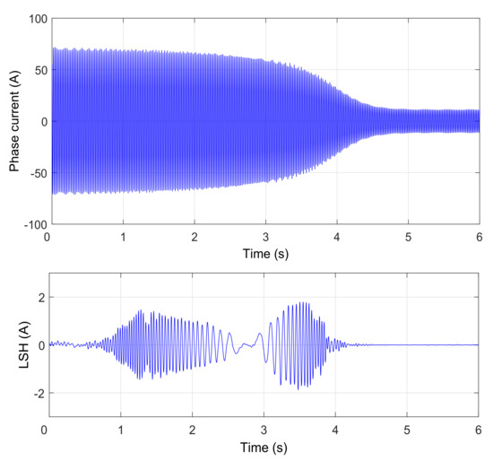 - Second, the LSHst is isolated from the current signal using the DWT [54]. More accurately, the signal of Figure 2 (bottom) is the approximation of level 4 (a4) of the wavelet decomposition of the current of Figure 2 (top), using Daubechies-44 as mother wavelet. Since the time increment used in the simulation is = 0.001 s, the sub-signal is formed by the components of the current included in the interval [0, 31.25] Hz; since in a machine with broken bars, the LSHst is by far the more prominent component in the frequency band below the supply frequency ( = 50 Hz) [54], Figure 2 (bottom), can be taken as a good representation of the LSHst in that interval.