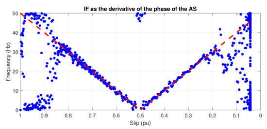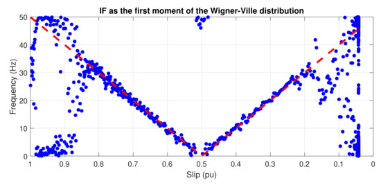 Instantaneous frequency of the LSHst in the slip–frequency plane, obtained from the WVD. Dashed, red line: theoretical evolution of the fault harmonic. Blue dots: evolution of the LSHst of the simulated machine.