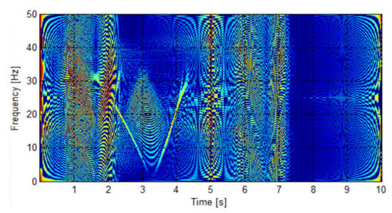 The WVD has been applied to the simulated LSHst of Figure 2 (bottom), and the result is presented in Figure 4. A disadvantage of the WVD, and in general of the quadratic transforms, is the presence of interference cross-terms, which can be observed in Figure 4. More complex transforms of the Cohen’s class have been designed to minimize these cross-terms, as the smoothed pseudo Wigner distribution (SPWD) and the Choi–Williams distribution (CWD) [57]. Nevertheless, the cross-terms hardly affect the first conditional moment when calculating the IF, as shown in Figure 4, which justifies the choice of the WVD as the simplest one in the Cohen’s group for calculating the IF of the fault harmonics.
