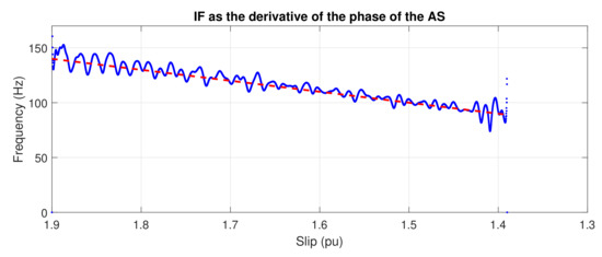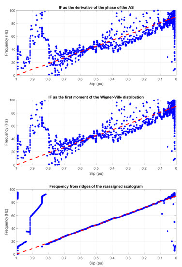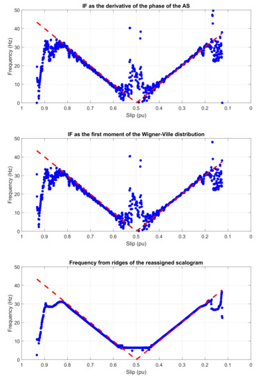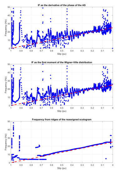 The procedure for presenting the three selected methods consists of applying each method to obtain the IF of the LSHst of Figure 2 (bottom) in the slip–frequency plane, and comparing it with the theoretical IF given by Equation (1).