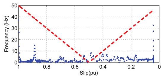 Instantaneous frequency of the LSHst in the slip–frequency plane, obtained from the scalogram ridges. Dashed, red line: theoretical evolution of the fault harmonic. Blue dots: evolution of the LSHst of the simulated machine.