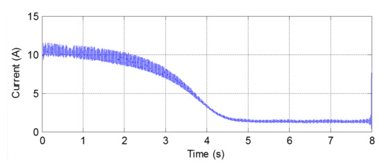 The current and the speed recorded during the start-up transient are shown in Figure 14. For calculating the IF of the mixed eccentricity components, it is necessary to extract them from the start-up current signal; the extraction of these components is more complex than in the case of bar breakages because their amplitude is substantially smaller. In this paper, the extraction of the ME components during the start-up is performed following the process described in [60]: first, the Hilbert transform is applied to the current signal for obtaining its envelope, the instantaneous amplitude of the analytic signal (see Figure 15); then, the eccentricity components are easily extracted by applying a high pass filter to this envelope, which behaves as a quasi-continuous signal.