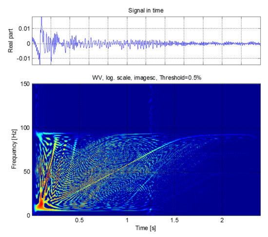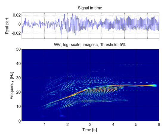 The distribution of the energy of the LSHst in the joint time-frequency plane can be obtained applying a time-frequency distribution to this signal [55], and joining the points with the highest amplitude. The Wigner–Ville distribution, as other quadratic distributions, is particularly well suited for tracking signals with a linear variation of the IF, such as the LSHT. The time-frequency distributions presented in this paper have been calculated using the code given by [56]. The WVD belongs to a wider group of time frequency distributions [55], known as Cohen’s class distributions. One of the properties of these transforms is that the first conditional moment of frequency for a given time (the average of the frequencies existing in the time-frequency plane for a given time) gives exactly the IF of the signal, as defined by Equation (7). The WVD is the simplest transform of this group. It is given by:
