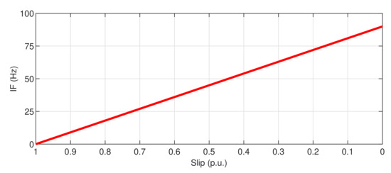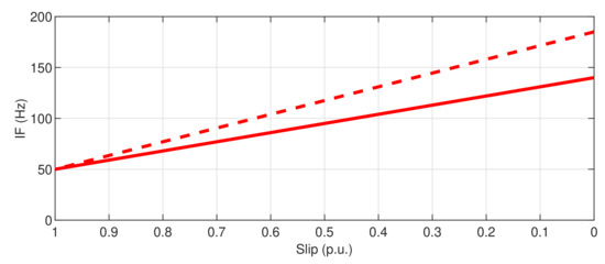 The theoretical IF of the fault harmonics generated by a ME fault in the slip–frequency plane, applying Equation (2), consists only of two straight segments, with a slope equal to . In the case of the motor used in this section (Appendix B), which is a two pole pairs machine, , so Equation (2) becomes