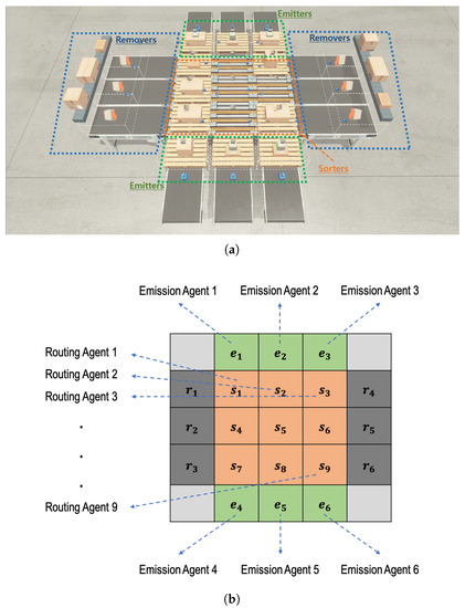 The sorters are deployed in the form of an grid, and each of them is controlled by an independent routing RL agent, allowing the system to have a flexible structure. On the other hand, emitters are deployed on the side of the grid, and each of them is controlled by an independent emission RL agent. The number and location of emitters are determined by the system requirements. Similarly, removers are deployed on the side of the grid, and the number and location of removers are determined by the system requirements, as well. However, there is no RL agent for a remover. This means that a remover’s behavior is determined passively by the adjacent sorter’s behavior.