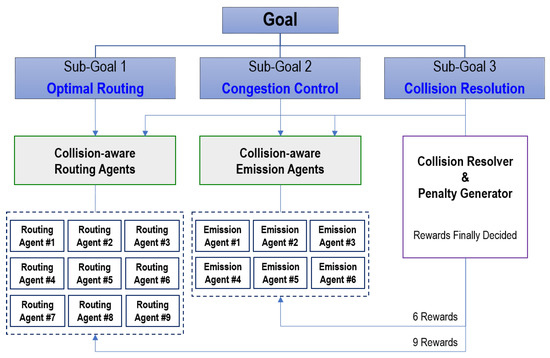 It should be noted that the routing or emission agents whose actions are altered by the collision resolver to “Stop (0)” will be penalized when they receive the reward from the target system at the next time step. In Figure 4, the agents where the penalty is imposed are denoted by the solid red circles. The original rewards at time step are first delivered to the penalty generator (co-located with the collision resolver), and the pre-defined penalty values are imposed in the rewards per agent depending on the selection decision of the collision resolver at time step t. There are two kinds of collision penalty values, which are presented in Table 1: (1) for a routing agent and (2) for an emission agent . For the two penalty values, the same negative coefficient is used. Therefore, the original rewards and are changed into and as follows: