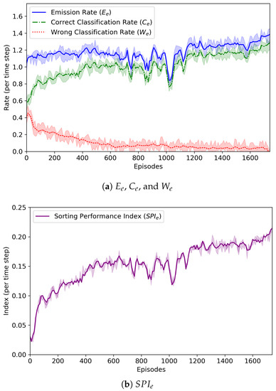 Figure 5 reveals the change of the average emission rate , average correct classification rate , average wrong classification rate , and sorting performance index for each episode e. By using Equation (3), the emission rate is simply defined as: