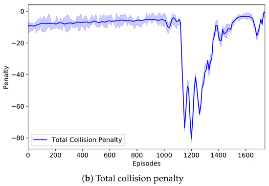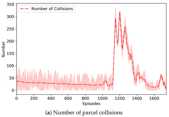 Figure 6 depicts the change of the number of parcel collisions that may occur in our three-grid sortation system and also represents the change of the total collision penalty imposed on routing and emission agents. In the system, parcels were generated randomly regardless of their type and order, and they should be classified to their designated removers. However, the number of sorters was relatively small, so that there were not enough buffers where parcels moved and were located. This directly led to numerous collisions (or congestion) of parcels. Through repeated learning, however, routing agents were increasingly good at finding the optimal route for parcels, and the emission agents were also increasingly good at controlling the congestion. Nevertheless, routing and emission agents may select their actions that can cause collisions of parcels. In the proposed system, the collision resolver changed them, so that the collision-resolved actions were finally performed on the system. Instead, the collision penalties were imposed as penalized rewards on the routing and emission agents causing the collisions. According to our experiments, the number of collisions varied largely during some episodes, but after those, the number of collisions became very low. It can be seen from Figure 6 that a similar situation occurred. The number of collisions began to vary from about 1000 episodes, and thus, the total collision penalty was changed accordingly. It is noted that the episode (i.e., the 1780th episode) where the best model was saved was the one where the number of collisions almost became zero after the number of collisions was varied.