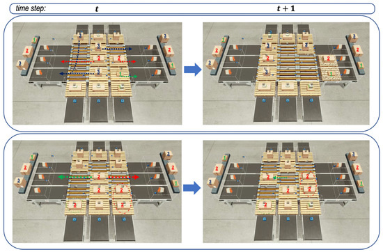 Finally, Figure 7 depicts the behavior of emitters and sorters that were controlled by the well-trained RL agents. In fact, the well-trained RL agents had the models saved at the 1780th episode. The figure shows the behaviors between two successive time steps t and on the left and right sub-figures, so that we can try to expect the next behaviors of emitters and sorters from the left sub-figure and check the behaviors selected by emitters and sorters from the right sub-figure. By expecting and checking from two sub-figures, we could know that the agents performed their actions well, as expected.