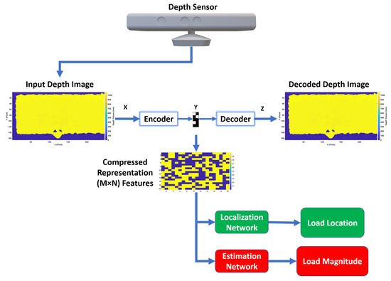 After the critical information is extracted from the input depth features and is encoded at a smaller dimension using the proposed autoencoder, two different supervised ANNs for realtime localization and estimation of loads can then be utilized, as illustrated in Figure 1.