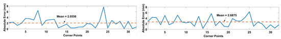 After the RGB and Depth images were mapped, the difference between the deflections that were measured by Kinect V1 and laser ranger at corner points were calculated. To account for errors in corner detection and mapping, for each detected corner pixel from RGB image, a window of pixels was chosen from the corresponding depth image. A Leica DISTO X310 laser meter [38] with ±1 mm accuracy was used for evaluating the accuracy of Kinect V1. Loads with magnitudes of 2.45, 4.9, 7.35, 9.81, 12.26, and 14.71 N were placed on position 4 of the wing and the deflections were measured using both the Kinect V1 and Leica DX310 sensors. The obtained results are shown in the left image of Figure 10 for 2.45 N load, in which the mean absolute error for the 32 corner points was measured to be 2.0556 mm with a standard deviation of 1.74 mm. This was repeated for 100 frames, and the obtained results are shown in the left image of Figure 11, in which the mean of absolute errors was measured to be 2.0642 mm with a standard deviation of 0.21 mm. Similarly, the results obtained for 14.71 N load are shown in right images of Figure 10 and Figure 11, in which the mean absolute error for 32 corner points was calculated to be 2.6875 mm and 2.1520 mm for a single and 100 frames, respectively, with standard deviations of 1.615 mm and 0.26 mm. The same procedure was repeated for all of the aforementioned loads that range from 2.45 to 14.71 N, and the obtained results are summarized in Table 1. These results show that for the required working conditions, the Kinect V1 has an accuracy of ±2.25 mm with a standard deviation of 0.28 mm and a resolution of 1 mm. Therefore, since the deflections due to different loads range from 1 mm to 19 mm in this work, the Kinect V1 is proved to be suitable for acquiring the deflection measurements reliably. Moreover, neural networks already take the noise of the sensors into account when they are trained with the data acquired from them; therefore, the small noises in the acquired data are taken care of by the proposed method.