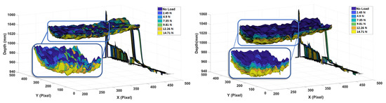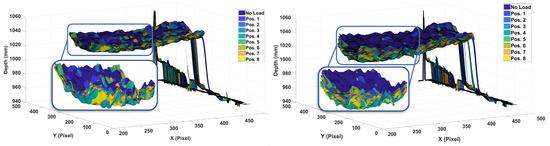 Moreover, in order to show the effect of the same load applied on different sections of the wing, loads of 2.45 and 14.71 N were applied on all eight distinct partitions of the wing, and the resulting depth images were plotted in Figure 13. These results clearly indicate that the wing deflection profile is different even when the same load is applied on different locations. Furthermore, by observing these results one can see a strong relationship between the behavior of the deflection of the wing for loads placed in parallel, namely loads placed at Positions 1 and 5, 2 and 6, 3 and 6, 4 and 8. These results prove the effectiveness of Microsoft Kinect V1 sensor for wing deflection measurement under various loading conditions acting on distinct sections of the wing.