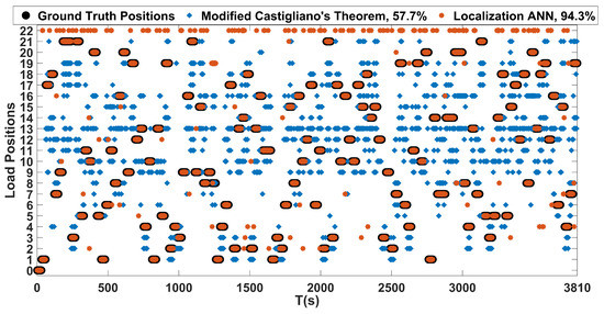 As for load localization that is based on the modified Castigliano’s theorem, its performance was also evaluated on the constructed test dataset. The proposed localization ANN was trained with the load locations shown in Figure 14. Outputs of the proposed localization network with an encoded data size of 1200 and the one based on Castigliano’s theorem are plotted against the ground truth positions in Figure 15. In this figure, the label denoted as zero represents the no load case, labels 1 to 8 represent the concentrated load positions, labels 9 to 21 represent the distributed load positions, and label 22 represents misclassified outputs that do not belong to any of the aforementioned load positions. From these results, one can see that both frameworks are able to discern the locations of the loads causing different kinds of bending and twisting deflections on the wing rather successfully. However, the accuracy of the proposed ANN based framework is superior to the one that is based on Castigliano’s theorem, as visible from the results obtained in Figure 15 and the obtained accuracies given in Table 4. More importantly, the proposed neural network based method exhibits invariance to the type of the applied load and is able to successfully localize both concentrated and distributed loads causing wing deflections, which the framework based on modified Castigliano’s theorem fails to do so properly.