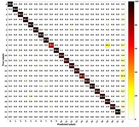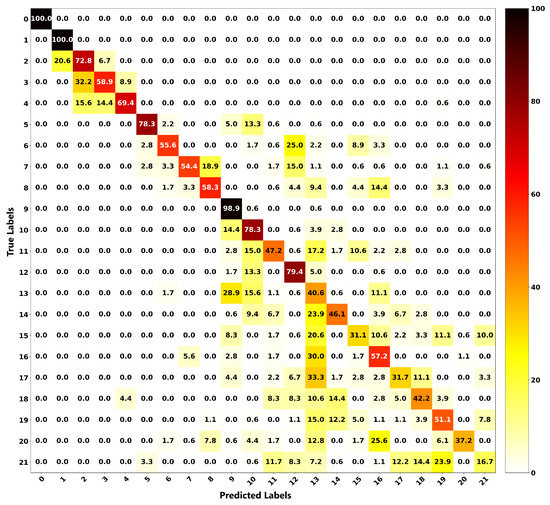 The relationship between the ground truth and the estimations of both frameworks is illustrated as a confusion matrix in order to get more insight into the localization performance of both methods. Figure 16 shows the confusion matrix for the proposed localization ANN, and Figure 17 is for the modified Castigliano’s theorem. From these plots, it can be seen that the correct estimations are on the diagonal and any points not located on this line represent misclassified outputs. For the ANN framework, all of the position estimations have accuracies of higher than 90%, except for Positions 8 and 14. Nonetheless, their accuracies are still high, being 76.7% and 86.1%, respectively. As observed from Figure 16, Position 8, which is a concentrated load, is misclassified 16.1% of the time as Position 19, which is a distributed load. This observation is due to the wing deflection profiles under these loading conditions having similar patterns. However, these observations seem to be worse for the results obtained through the modified Castigliano’s theorem, especially in the case of distributed loads, as seen in Figure 17. This is due to the fact that measured deflections exhibit very similar patterns at different points and, therefore, can not be accurately captured unless a more robust model such as the proposed ANN one is used to classify them in an appropriate manner.