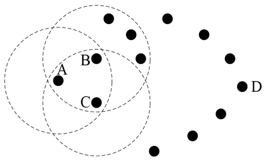 As shown in Figure 2, node A sends a data packet to target node D. The distances between its neighbors B and C to the target node are the same, but the density of nodes in the signal coverage of node B is greater than that of node C. It can be seen from the figure that if node A forwards the data packet to node B, the subsequent feasibility of establishing a routing path is greater than that of node C. Thus, node density is also one of the important indicators that affect routing performance. The higher the node density, the greater the possibility of routing, and the more likely it is to establish a reliable routing link and improve the delivery rate of data packets.