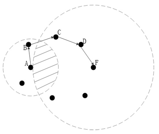 When the distance from the current node to the target node is less than the distance from its neighbors to the target node, the greedy forwarding strategy will be invalidated, and the repair strategy will be executed. The traditional repair strategy uses the right-hand rule to deliver data packets, as shown in Figure 3. Node A sends a data packet to node F, traverses its neighbors in a counterclockwise direction according to the right-hand rule, and repeats until the data packet reaches the target node or meets the condition of greedy forwarding to leave the repair strategy. The link path obtained by delivering the data packet according to the right-hand rule in Figure 3 is A-B-C-D-F.