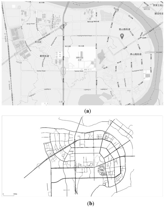 Schematic diagram of the road traffic model: (a) map of Tianyuan District, Zhuzhou City, Hunan Province; (b) schematic diagram of road files generated by SUMO.
