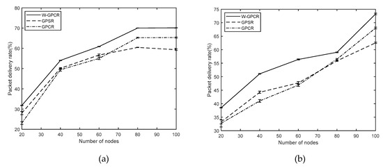 Figure 7 shows the packet delivery rate of different numbers of nodes and CBR connections. As the number of nodes in the network increases, the connectivity of the network is improved, and the probability of encountering routing holes is reduced. Therefore, with the increase of the number of nodes in the network, the packet delivery rate of these three routing protocols increases. In networks with different numbers of nodes and different CBRs, the packet delivery rate of W-GPCR is higher than that of GPCR and GPSR. In sparse networks with CBR of 10 and 20, and nodes numbering 20, 40, and 60, the packet delivery rate of W-GPCR is much higher than that of GPCR and GPSR. Because the repair strategy of W-GPCR weight selection selects the next-hop node by weight, rather than simply relying on the right-hand rule to traverse the node, routing redundancy is reduced, data packets are prevented from being delivered away from the target node, and the stability of the system is improved.