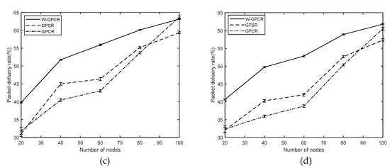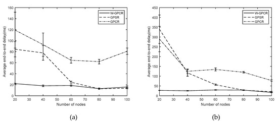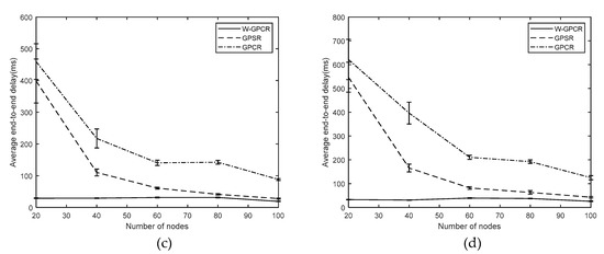 Figure 8 shows the average end-to-end delay for different numbers of nodes and CBR connections. In networks with different numbers of nodes and different CBRs, the average end-to-end delay of W-GPCR is lower than that of GPCR and GPSR. In addition, in the case of the same CBR, the average end-to-end delay of W-GPCR in the network scenario with a differing number of nodes is almost the same. On the contrary, the jitter of GPCR and GPSR is very large. As the number of nodes increases, the average end-to-end delay gradually decreases, and the stability of W-GPCR is stronger than that of GPCR and GPSR. The greedy forwarding strategy selected by the weight of W-GPCR is more global than the greedy forwarding strategy of GPCR and GPSR, which simply considers the distance to the target node. By considering the movement direction and node density of the node, the node with the largest weight among the neighbor nodes is selected as the next-hop node to avoid the packet delivery falling into a local optimum, thus greatly improving the performance of W-GPCR.