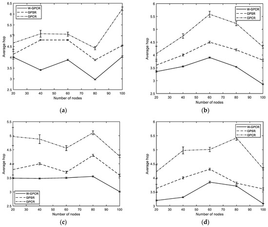 Figure 9 shows the average number of hops for different nodes and CBR connections. In networks with a different number of nodes and different CBRs, the average hop count of W-GPCR is less than that of GPCR and GPSR. Because W-GPCR’s restricted forwarding strategy for routing holes in a sparse network provides more routing possibilities, the possibility of successfully delivering data packets to the target node is also greater. W-GPCR can reduce the number of redundant routing hops in the global path of packet delivery, reducing the network overhead of the system.