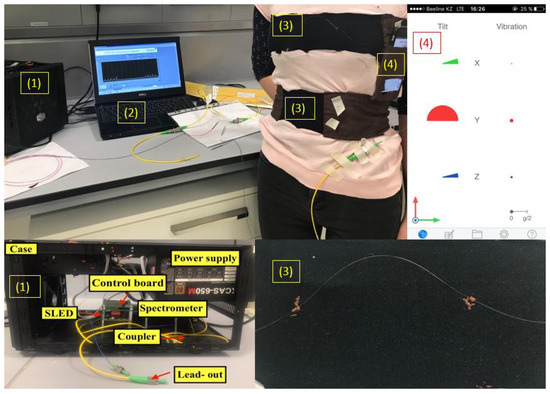 The experimental setup, which is illustrated in Figure 1, consists of the (1) I-MON interrogator connected to (2) PC with evaluation software, (3) T-shirt with two belts each equipped with an array of 5 FBGs, (4) mobile phone with VibSensor application.