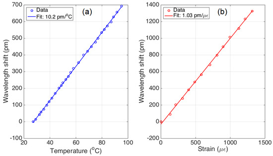 The temperature and strain coefficients are used to express the wavelength shift, according to the following equation [32]: