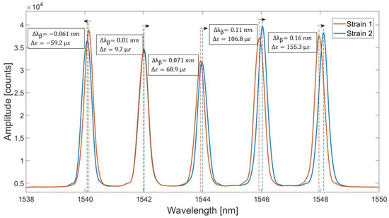 Reflection spectrum of the 5 FBGs array exposed to different strains (strain 1 and strain 2). The arrows shows the direction of the wavelength shifts for each FBG due to the strain applied to the array.