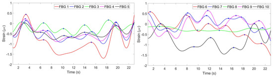 The algorithm is aimed at finding the most common pattern, reflecting opposite strains and neglecting discrepant patterns. This is achieved by firstly identifying positive and negative peaks of all FBGs. If at least 6 FBGs out of ten detected either positive or negative peak at approximately same time, this peak is considered as correct. The strain pattern of FBGs with correct negative peaks are multiplied by −1. FBGs which have less than 30% correctly detected peaks are assumed to produce wrong pattern and is neglected by multiplying its strain change by 0.
