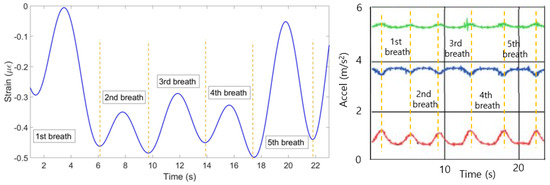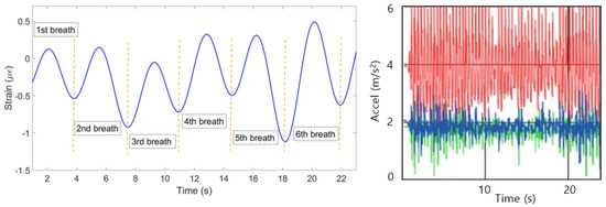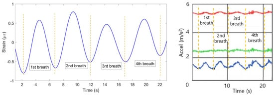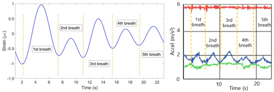 (2) The strain change detected by FBGs is a result of not only breathing, but all the movements of the chest and abdomen including heart beat and motions of a person. Therefore, the strain has to be filtered in order to obtain the components responsible for breathing only. This has been done by converting the strain pattern to frequency domain by Fast Fourier Transform. People’s normal breathing rate is about 20 breaths per minute [34] (0.33 Hz), so everything higher than this frequency has been filtered. Then the signal has been converted back to time domain and the strain patterns shown on Figure 7 have been obtained.