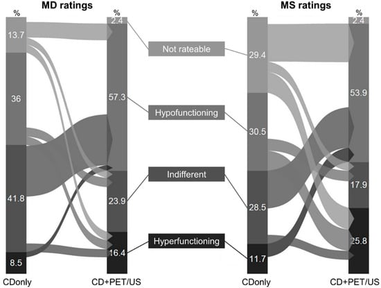 On CDonly (CD+PET/US) 8.5% (16.4%), 41.8% (23.9%), 36.0% (57.3%), and 13.7% (2.4%) of the TN were rated as hyperfunctioning, indifferent, hypofunctioning, and not rateable by MD, respectively (p < 0.0001 for all values). MS rated 11.7% (25.8%), 28.5% (17.9%), 30.5% (53.9%), 29.4% (2.4%) of the TN as hyperfunctioning, indifferent, hypofunctioning, and not rateable, respectively, on CDonly (CD+PET/US) (p < 0.0001 for all values) (Table 1). Thus, highly significant more hyper- and hypo-functioning TN as well as less indifferent TN were assessed on CD+PET/US in comparison to CDonly by both MD and MS. The number of not rateable TN decreased when I-124-PET/US was added to CD, especially in the MS group. The highest rating alterations between CDonly and CD+PET/US were observed for indifferent TN on CDonly shifting to hypofunctioning TN on CD+PET/US in MD ratings, and for not rateable or indifferent TN on CDonly shifting to hypofunctioning TN on CD+PET/US in MS ratings (Figure 1).