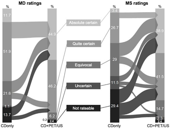 Illustration of the relative rating shifts in the observers’ confidence in functional assessment of thyroid nodules (TN) between conventional diagnostics (CDonly) and CD+I-124-PET/US fusion imaging (CD+PET/US). The left part of the graphic represents the ratings of the nuclear medicine physicians (medical doctors, MD) and the right part the ratings of the medical students (MS).