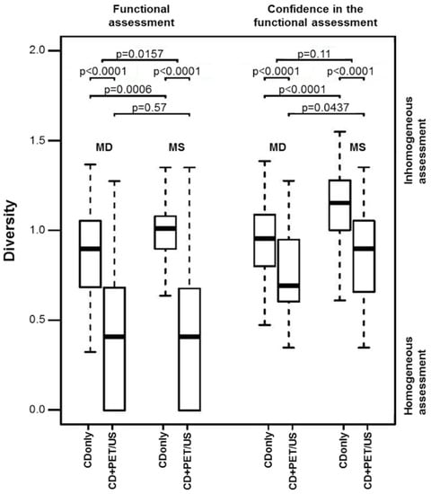Approximations of the rating results of MD and MS were observed for certain ratings (absolute certain + quite certain) between CDonly (p < 0.0001) and CD+PET/US (p = 0.0004) as well as for the share of not rateable TN (CDonly p < 0.0001; CD+PET/US p = 0.99) (Table 2). Diversity analyses showed that there was a highly significant difference in the diversity of the observers’ confidence in functional assessment of TN between MD and MS on CDonly (0.93 vs. 1.16, p < 0.0001), whereas CD+PET/US revealed weaker differences for both groups (0.66 vs. 0.83, p = 0.0437). With the additional application of I-124-PET/US, the rating diversity of both MD and MS markedly tend towards more consistency (p < 0.0001 in each case) (Figure 3).