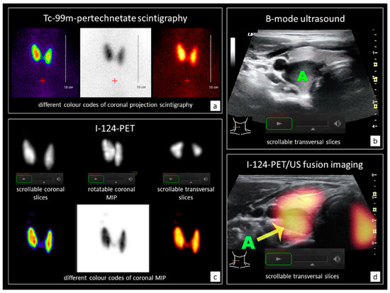 Exemplary extracts from a digital patient case file (PCF) of a 34-year old female with a single thyroid nodule (23 × 14 × 13 mm, 2.0 mL) in the right-sided thyroid lobe. (a) Tc-99m-pertechnetate scintigraphy in coronal orientation presented in three different colour codes (spectrum, inverted grayscale, and hot body); (b) Scrollable B-mode ultrasound (US) of the right lobe in transversal orientation. The solitary dorsal nodule is marked (A). (c) I-124-PET images of the thyroid presented in scrollable coronal and transversal slices as well as in a rotatable coronal maximum intention projection (MIP) in grayscale in the upper row. Furthermore, coronal orientated MIPs in three different colour codes (spectrum, inverted grayscale, and hot body) are presented in the lower row. (d) Scrollable I-124-PET/US fusion images of the right lobe in transversal orientation. The solitary dorsal nodule is marked (A). In the PCF with conventional diagnostics only (CDonly), this dorsally located nodule was prevailingly rated as indifferent with uncertain confidence by nuclear medicine physicians (medical doctors, MD) and as not rateable by medical students (MS). In the PCF with additional I-124-PET/US fusion imaging (CD+PET/US), all observers rated the nodule as indifferent with absolute or quite certainty. The entire PCF presented to the observers included further images such as transversal- and sagittal-orientated images of the whole thyroid on both B-mode US and I-124-PET/US fusion imaging, as well as further clinical data such as the thyroid volume (15 mL, right lobe: 10 mL, left lobe: 5 mL), the Tc-99m-uptake (2.02%, right lobe: 1.16%, left lobe: 0.86%), the blood levels (TSH-level: 3.6 mU/l, no pathological antibodies), and symptoms (globus sensation).