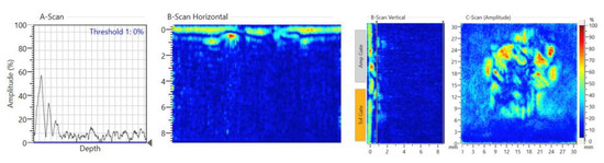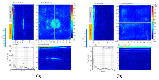 At the end of the manufacturing process, the composite specimen was inspected via C-Scan (DolphiCam CF08), and non-destructive test (NDT) results are shown in Figure 4. As can be seen in Figure 4a, the position of embedded PZT transducer can be detected, which is in the middle of the panel according to the vertical/horizontal B-Scan. In Figure 4b, the non-embedding areas show that the bonding quality of the specimen is good and there is no defect in the specimen.