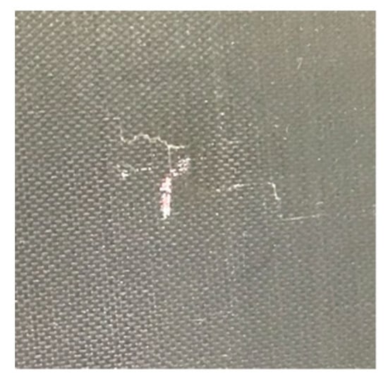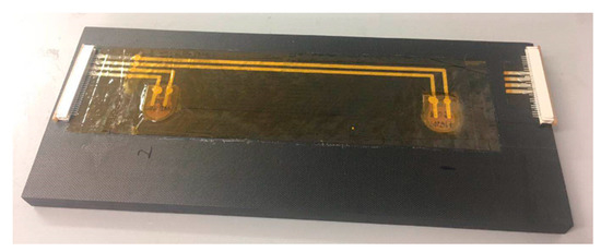 For the surface-mounting procedure, two small layers of adhesive film were placed over the mould side of the specimen for bonding the Kapton® and the specimen. The surface-mounted Kapton® was placed over the adhesive films at the designated position, where two PZT transducers were in same positions as these embedded transducers. Then, these extra adhesive films were removed slightly using a knife, and the surface-mounted Kapton® was fixed using blue tape. The panel was placed on the heated vacuum table to cure for one hour at 150 °C and allowed to cool down to room temperature to make sure the melting adhesive liquids would not flow out. After bonding, the specimen was trimmed, and two connectors (RS 514-4408, operating temperature range: −40 °C to 85 °C) were placed to designated areas to connect embedded and surface-mounted circuits and bonded by the super glue (RS 473-445, operating temperature range: −50 °C to 80 °C). The final specimen with a surface-mounted diagnostic layer is shown in Figure 5.