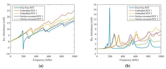 Electrical-Mechanical Impedance (EMI) admittances of (a) imaginary parts and (b) real parts of free-free, embedded and surface-mounted lead zirconate titanate (PZT) transducers.