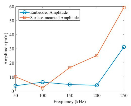 A National Instruments (NI) PXIe-1073 was used for signal measurements, where a NI PXI-5412 arbitrary signal generator was used for signal generation, and a NI PXI-5105 digitiser was used to record Lamb wave signals. The specimen was measured at excitation central frequencies of 50 kHz, 100 kHz, 150 kHz, 200 kHz and 250 kHz under room temperature. A five-cycle Hanning-windowed toneburst signal was used, and the amplitude and sampling frequency were 6 V and 100 MHz, respectively. The reversibility and repeatability of two paths for both embedded and surface-mounted signals were found to be good. To summarise the relationship between the peak amplitude of the first wave packet at five excitation frequencies, Hilbert transform was used to obtain envelope signals, then the amplitude was selected from the first peak value of each envelope signals. As is shown in Figure 7, the amplitude of the surface-mounted signal is larger than that of the embedded signal, except for at 100 kHz. This is due to tuning properties, where S0/A0 mode exhibits various amplitudes under different frequencies [50,51].