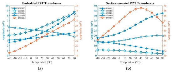 Temperature influences on amplitude for (a) embedded and (b) surface-mounted signals.