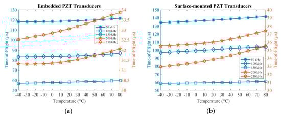 As can be seen in Figure 8a, when increasing the temperature, the amplitude at 50 kHz, 100 kHz, 200 kHz and 250 kHz increases, while the amplitude at 150 kHz decreases for embedded signals. In Figure 8b, the amplitude increases at 150 kHz and 200 kHz and decreases at 50 kHz and 100 kHz when increasing the temperature for surface-mounted signals. In addition, the amplitude increases from −40 to 40 °C and then decreases from 40 to 80 °C at 250 kHz when increasing the temperature. As can be seen in Figure 9, the value of time-of-flight increases when increasing the temperature for both embedded and surface-mounted signals.