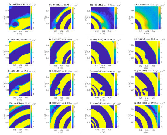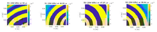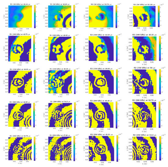 Chirp signals were reconstructed in five-cycle tuneburst signals with Hanning-window at different frequencies using the algorithm based on equations in Reference [59]. Figure 11 shows LDV scanning results for both embedded and surface-mounted PZT transducers at 50 kHz, 100 kHz, 150 kHz, 200 kHz and 250 kHz. In the case of the blue tack, the following observations can be made: 50 kHz, 100 kHz and 150 kHz can interact with this blue tack damage and there is no scattering at 200 kHz and 250 kHz for both embedded and surface-mounted PZT transducers.