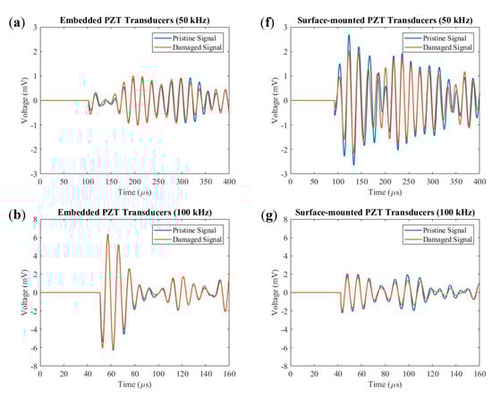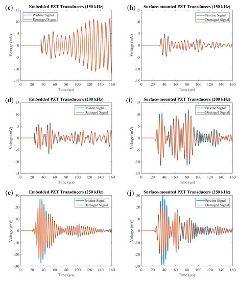 Signal comparisons between pristine and damage signals for (a)–(e) embedded and (f)–(j) surface-mounted PZT transducers at 50–250 kHz.