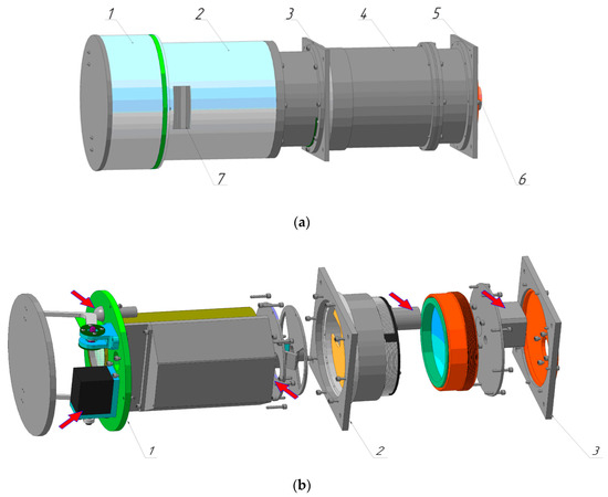 Appearance of hyperspectrometer: (a) with external housing: 1: cover unit, 2: case to protect the objective lens and fasten the cover unit to the hyperspectrometer, 3 and 5: brackets for fastening to a space vehicle, 4: hyperspectrometer case, 6: connector for plugging in thermal and terminal sensors, 7: hatch for connector access, and (b) without external housing: 1, 2, 3: units for fastening the spectrometer to a space vehicle. Mechanisms for optical calibration and moving the mirror and diffraction grating are shown by arrows.