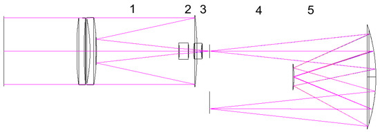 In this section, we analyze how temperature variations affect the imaging quality of the hyperspectrometer. For this purpose, the optical scheme of the hyperspectrometer was broken down into five essential segments whose varied length could have a significant impact on the imagery (Figure 2). Segments 1 and 2 denote distances between the optical elements in the objective, segment 3 denotes the distance from the end surface of the objective to a slit diaphragm, segment 4 denotes the distance from the plane of the slit diaphragm to the Offner’s primary mirror, and segment 5 denotes the distance between movable concentric mirrors.