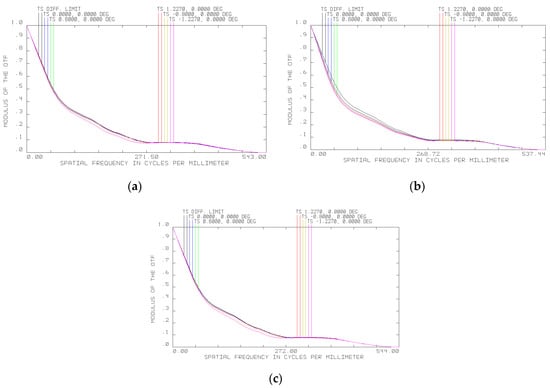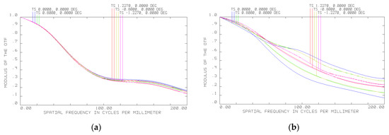 It can be seen from Figure 6 that the MTF becomes essentially narrower. However, in general, such deterioration can easily be compensated for by shifting the optical elements of the spectral unit relative to the photosensitive arrays. Specifically, the primary mirror and diffraction grating need to be moved, respectively 1.45 and 0.73 mm away from the objective at −40 °C and 0.27 and 0.135 mm toward the objective at +45 °C. Figure 7 shows the results of optical modeling of the MTF following the necessary shifts of the hyperspectrometer’s spectral unit elements to compensate for thermal deformations. The MTF is seen to be again close to the diffraction limit (Figure 7a,b).
