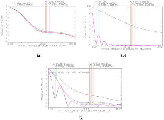 The modulation transfer function of the objective at 20, −40 and 45 °C is shown in Figure 5a–c, respectively. The modeling shows that at −40 °C, the focal length of the objective changes by 2.9 mm. This change can be compensated for by shifting the entire spectral unit by 1.45 mm (the value of the working segment variation). When the objective is heated to 45 °C, the objective parameters change somewhat less. If changes in the objective focal length are taken into account and the registration plane position is changed, the MTF of the objective changes insignificantly with changing temperature. At 45 °C, the change of the focal length is just 0.54 mm, making it possible to compensate for image distortions by moving the whole spectral unit by 0.27 mm.