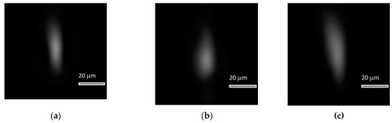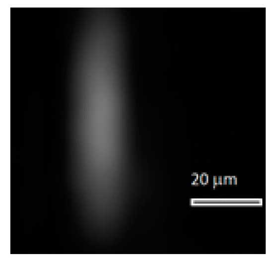 Intensity distributions in Figure 8 are elongated along the perpendicular direction to the diffraction grating grooves. In this direction, the PSF width at full-width half-minimum (FWHM) intensity is 22 µm for each intensity distribution (four pixels of the array). Along the grating grooves, the FWHM width is 11 µm (two pixels of the array). Thus, the PSF width remains practically unchanged in a fairly wide range of temperatures, which is also confirmed by the modeling results. For comparison purposes, Figure 9 presents an experimental PSF at 35 °C without adjustment. The PSF width is 33 µm (six pixels) measured perpendicular to the grating grooves, amounting to 16.5 µm (three pixels) measured along the grooves.