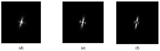 Figure 8a–c depicts experimental PSFs at 20, 40 and 12 °C respectively, which were derived after the positions of the two hyperspectrometer elements were adjusted by the values given in Table 3. For comparison, Figure 8d–f shows the PSFs calculated for the same temperatures using Zemax.