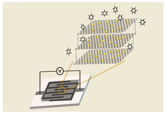 Industrial and human developments have been steadily increasing the production and the emission towards the environment of toxic and hazardous gases. Among the various types of pollutants, aromatic volatile organic compound vapors like benzene, toluene, and xylenes are widely used in numerous fields, most notably by the petrochemical and textile industries. According to the World Health Organization (WHO), a long-duration exposure to such compounds, especially to benzene, leads to life-threatening diseases [1]. As those vapors are harmful to both human health and the environment, the European parliament has stated via a council directive that the limit value for exposure to benzene [2] is 1.6 ppb. In addition, the US Occupational Safety and Health Administration has set permissible exposure limits (PLE), eight-hour time weighted average (TWA) concentrations for toluene and xylene, which are 10 ppm and 100 ppm, respectively [3,4]. Even though the human olfactory system can identify the characteristic odor of aromatic volatile compounds, the olfactory threshold in humans is well above the exposure limits described above. Furthermore, the olfactory system fails at correctly identifying the type of aromatic compound that may be present in a given environment. Taken together, these arguments support the idea that it is crucial to develop efficient ways for the accurate detection and monitoring of these vapors in terms of high sensitivity, good selectivity, low power consumption, low cost, and reversibility [5].