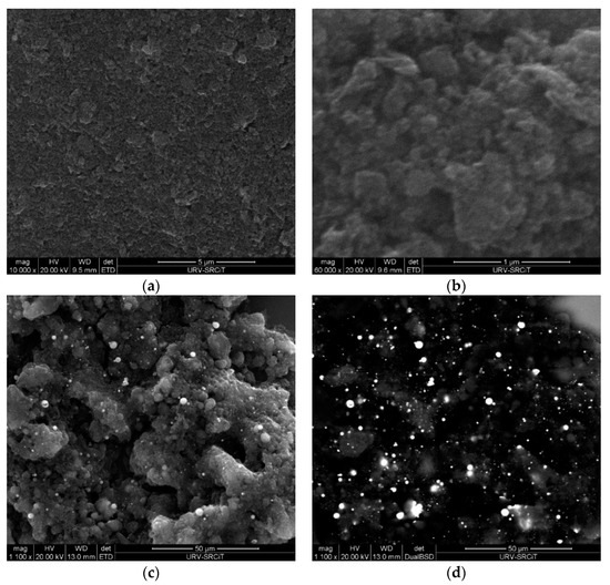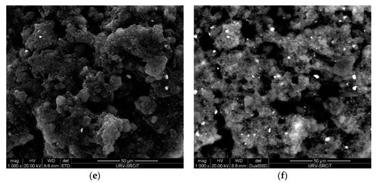 Additionally, ESEM images were obtained for pristine and graphene decorated with WO3 and SnO2. Figure 3a,b shows the ESEM images of graphene once it was deposited onto the substrate to be employed as a gas sensor at two different scales. In addition, in Figure 3c,e, the graphene decorated with WO3 and SnO2 are observed. In Figure 3d,f, a back-scattered electron detector (BSE) was used showing the graphene (black background) decorated with the metal oxide nanoparticles, which correspond to the bright spots. These images reveal a quite homogeneous distribution of WO3 and SnO2 metal oxide nanoparticles on the graphene surface.