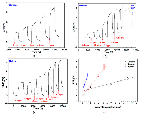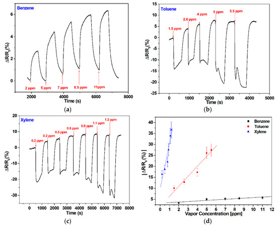 The vapors sensing performances at room temperature of the pristine graphene-based sensor towards the aromatic vapors benzene, toluene, and xylene are presented in Figure 4.